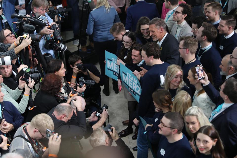 tttttttttttt2月23日,在德国柏林的基督教民主联盟总部,联盟党总理候选人默茨(中)在出口民调显示领先后接受祝贺。新华社记者杜哲宇摄tttttt